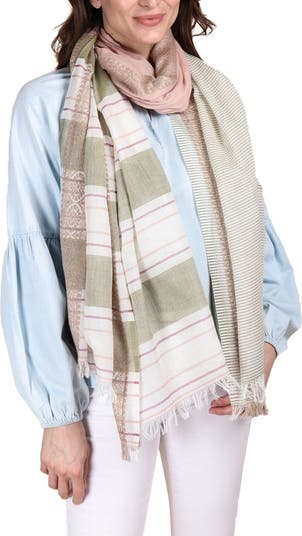 A medallion border gives a bohemian feel to this neutral-hued striped scarf cut from a lightweight blend of cotton and silk with a fluttering fringe.