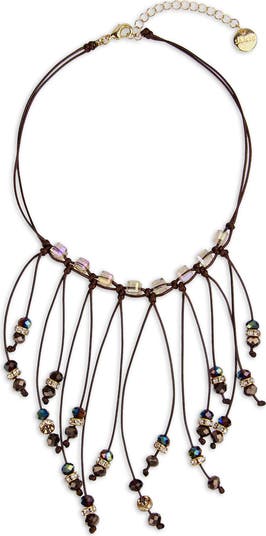 Faceted crystals and polished rondelles sparkle from this beaded fringe bib necklace that brings chic boho shine to your looks.