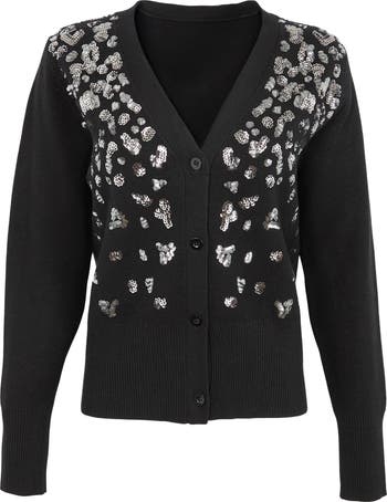 Shimmering sequins in a leopard spotted pattern brings fierce flair to this cozy V-neck cardigan.
