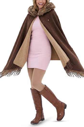 A knit scarf featuring fun fringed trim is topped by a roomy hood outlined by fluffy faux fur to make a dramatic statement on your cold-weather outings.
