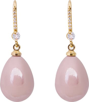Add a touch of sparkle to your look with a pearlescent teardrop elegantly suspended from a slender, crystal-adorned wire.