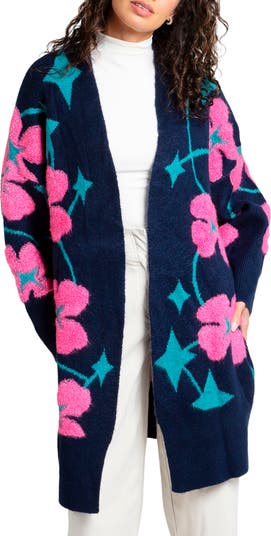 Feel the warmth of this lightweight cardigan knit in a longline silhouette with flowers.