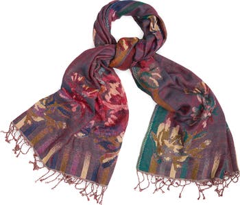 Bold with a hint of Bohemian flair, this cotton-rich scarf showcases a woven floral design and a fringed trim.