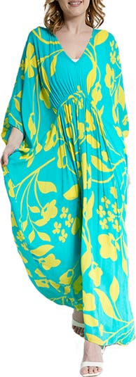 Hit the beach or kick it poolside in this flowy kaftan that features an allover floral pattern, kimono-inspired sleeves and a sharkbite hem.