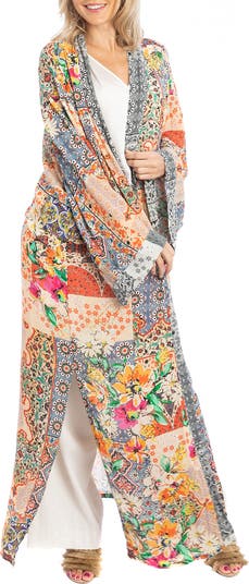 Add a boho touch to your ensemble with this floor-grazing ruana patterned with a mix of florals.