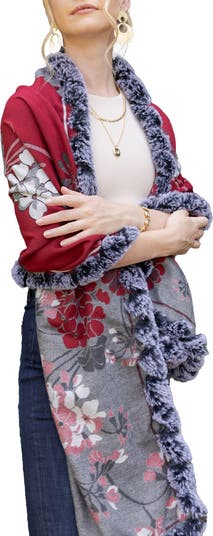 A garden of flowers bloom on this reversible scarf trimmed with plush faux fur.