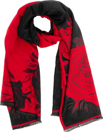 Reversible sides double the styling options of a lovely rose-patterned scarf that may also be worn as an elegant wrap or shawl.