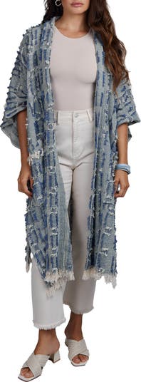 Add some texture to your free-spirited look with this denim duster that is styled with frayed geometric detailing.