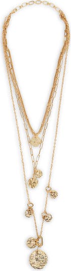 Hammered coin charms catch the light on this mixed-chain layered necklace that brings striking shine to everyday looks.