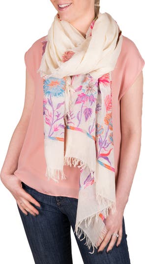 Add the perfect finishing touch to your ensemble with this frayed-trim cotton scarf patterned with a colorful floral print.