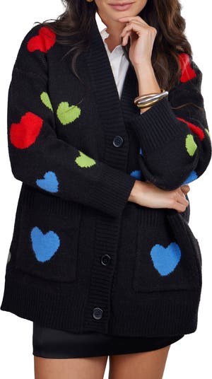 Love to layer in this eclectic cardigan styled in a buttoned silhouette with colorful hearts and deep pockets.