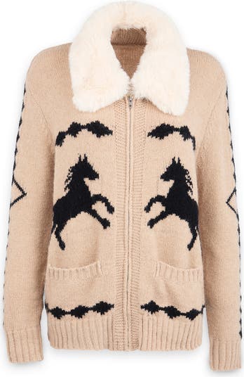 A pair of bucking broncos brings Western flair to this cozy cardigan sweater detailed with a plush faux-fur collar and an easy front-zip closure.
