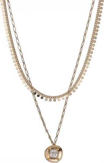 A layered charm necklace with a bezel set stone offers a timeless, refined style for any outfit.
