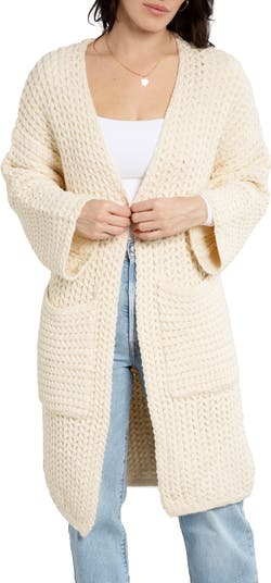 Keep cozy in this chic open-front cardigan that is styled with bold wide sleeves and handy pockets.