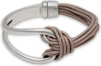 An open loop and knotted leather cords bring rustic charm to this sculptural bracelet secured by an easy magnetic clasp.