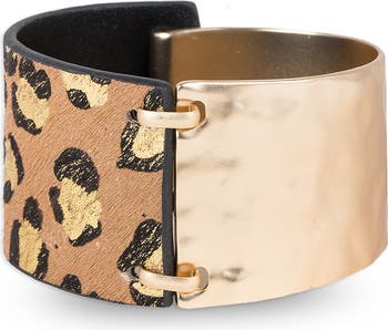 Leopard-printed genuine calf hair textures this stunning mixed-media cuff bracelet boasting a high-shine finish.
