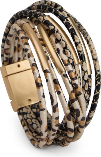 Fabulous animal prints embolden this chic layered bracelet composed of snakeskin-embossed faux-leather cords secured by a gleaming magnetic clasp.