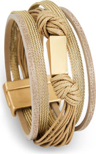 Knotted cords, woven beads and faux-leather strands texture this artfully layered bracelet secured by a gleaming magnetic clasp.