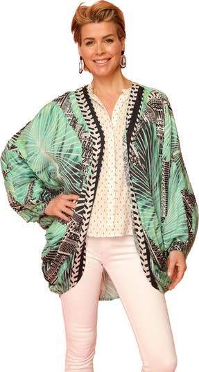 Vivacious tropical printing blooms across a lightweight wrap featuring dramatic wide sleeves for an ultrachic, layered look.