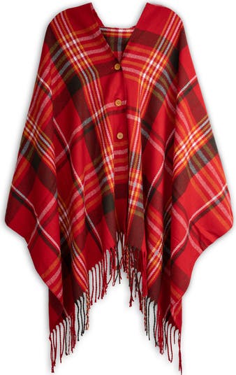 Flowy and free-spirited, this Bohemian-inspired plaid poncho features a front-button closure and fringe trim.