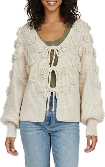 Budding rosettes and a trio of front ties channel the coquettish aesthetic on this cuddly cardigan knit with allover ribbing.