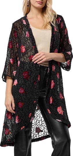 Top off any outfit with this elegant burnout velvet ruana featuring three-quarter length sleeves and a luxe floral dot pattern.