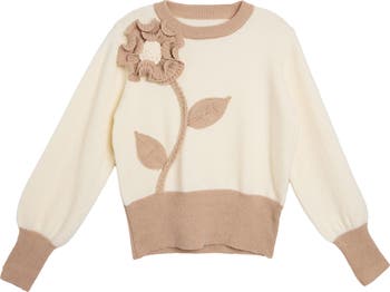 A 3-dimensional, ruffle-petal flower adds a playful flourish to this two-tone knit sweater finished with ribbed hems for a touch of vintage charm.