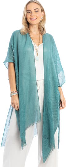 Show off boho-chic style in this semisheer woven ruana featuring shimmering sequins and a frayed sharkbite hem.