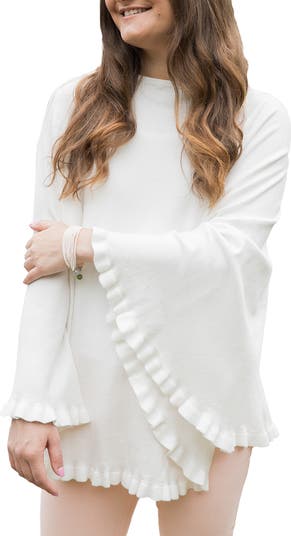 Delicate ruffles trim the hemline of this lightweight poncho knit from supersoft materials.