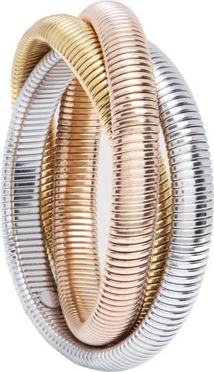 Triple tones amp up the style points of this coiled wrap bracelet that snakes up your wrist with a trend-forward flourish.