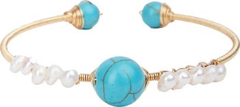 This slender cuff bracelet plated in 18-karat gold is shimmering with freshwater pearls and turquoise that make a colorful statement.