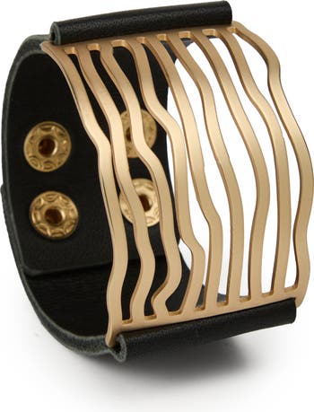 Get a stacked look with this sculptural caged bracelet secured by wide leather straps for chic boho style.