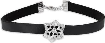 Pavé crystals illuminate a mini cutout flower on this soft leather choker necklace that brings dainty sparkle to everyday looks.