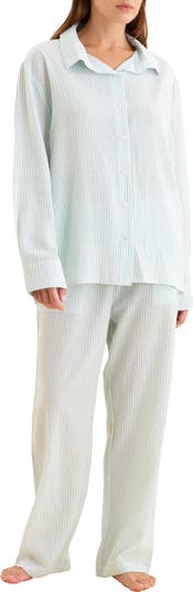 Slumber or simply lounge in the breathable freshness of these softly oversized pajamas cut from striped cotton-blend seersucker.