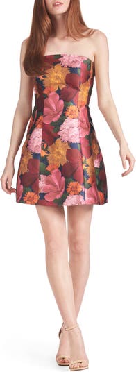 Stunning blooms make a bold impression wherever you go in this strapless mikado cocktail dress with princess seams and a flared skirt.