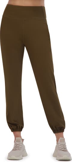 Handy side pockets frame skinny performance joggers constructed from moisture-wicking stretch-nylon interlock with a soft peached finish.