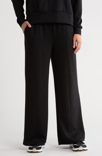 Comfort is yours in these wide- leg pants detailed with front seams and topped with an easy elastic waist.