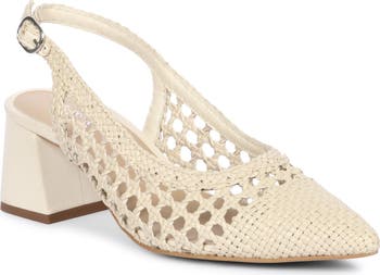 An intricately woven design inspired by classic wicker brings warm-weather charm to a block-heel slingback pump crafted from luxe leather.