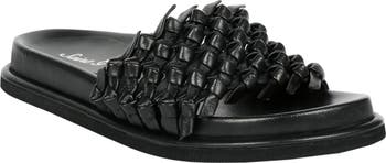 Knotted accents create modern intrigue at the vamp of a slide sandal rendered in rich leather for luxe appeal.