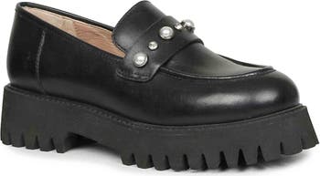 Pearly beads and jewel embellishments add modern elegance to a lofty loafer set on a chunky platform and block heel.