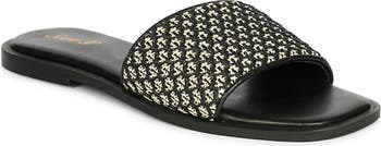 Smooth leather and finely woven raffia create textural interplay on a weekend-ready slide sandal grounded by a lightweight sole.