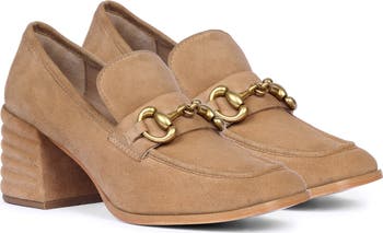 Brushed bit hardware and a loafer-inspired topline add sophisticated elements to a creamy suede pump balanced by a squared-off moc toe and sculptural block heel.