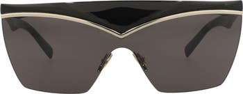 Polished golden hardware enhances the sharp browline of shield sunglasses that bring a futuristic vibe to everyday looks.