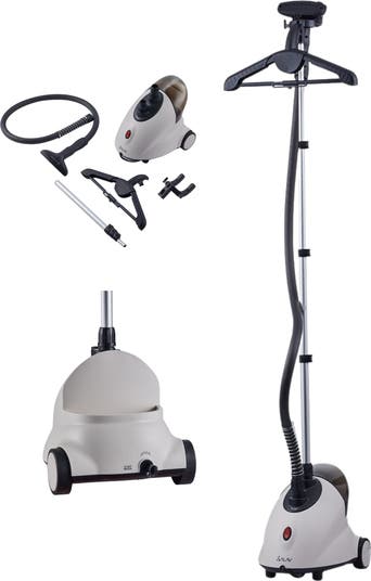 Remove wrinkles with ease using this full-sized garment steamer that has wheels and a folding, adjustable hanger and a cordless rechargeable lint remover.