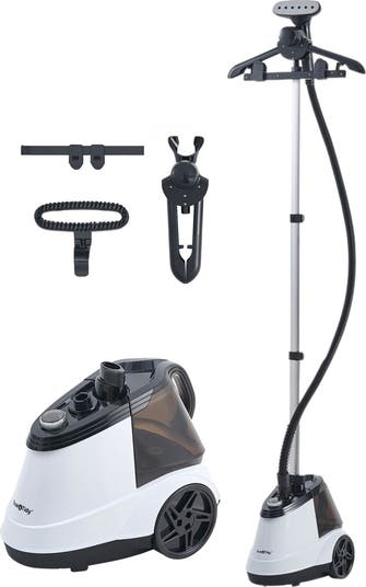 Remove wrinkles with ease using this full-sized garment steamer that has wheels and a folding, adjustable hanger and a cordless rechargeable lint remover.