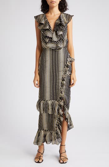 Ruffled edges impart lavish texture to a delicate silk devoré gown in a mesmerizing floral pattern.