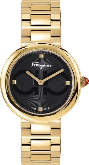 Embrace your inner clock-watcher with this chic Swiss-made timepiece with a double-gancio–detailed guilloche dial and an iconic red cabochon centering the stem.