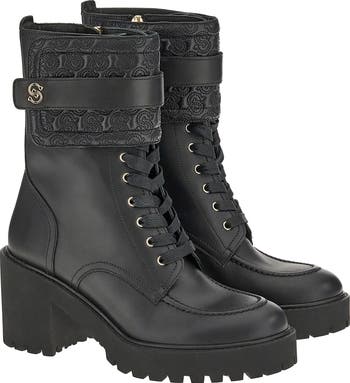 A wide ankle cuff detailed with allover Gancio embroidery distinguishes this utility-inspired lace-up boot grounded by chunky heel and toothy lug sole.