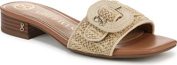 A low stacked block heel adds of-the-moment flair to this slide sandal topped by a wide vamp strap covered in a richly woven texture and buckled hardware.