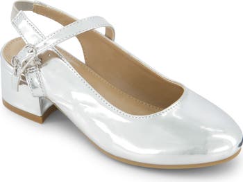 A logo-shaped buckle adds irresistible sparkle to this metallic Mary Jane dress shoe with a block heel for a little lift that'll let your little one shine at any occasion.